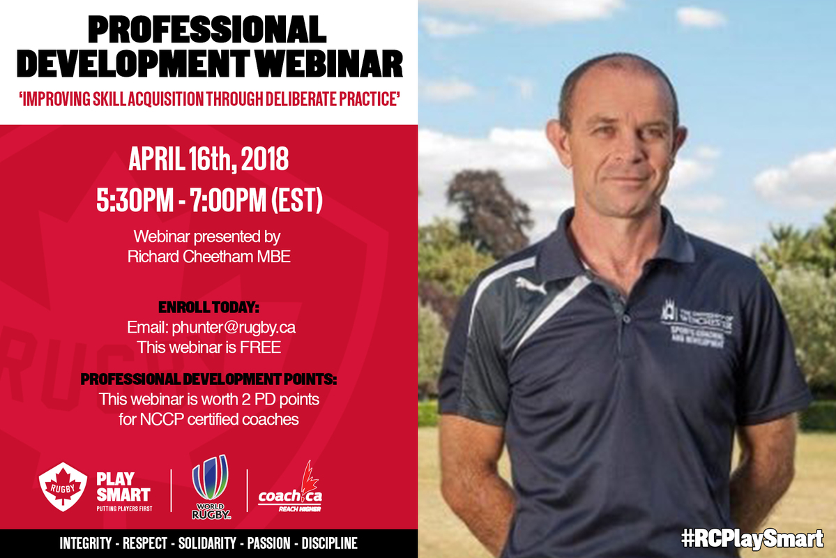Rugby Canada will be hosting a free professional development webinar presented by Richard Cheetham MBE for all coaches on April 16th and will be discussing improving skill acquisition through deliberate practice.